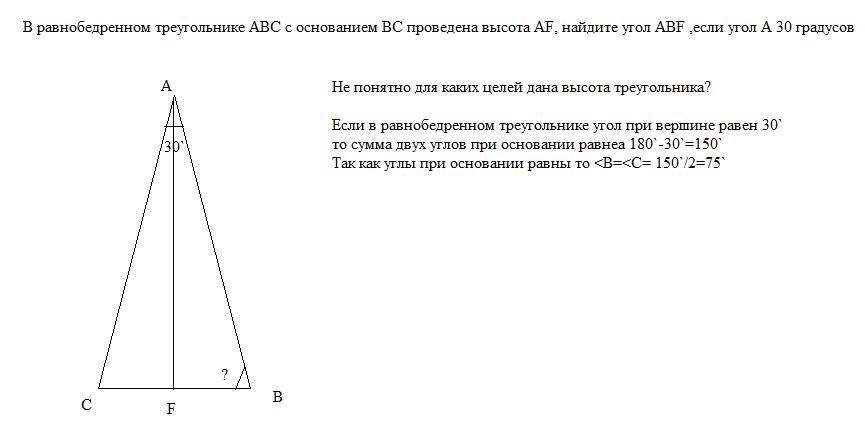 В равнобедренном треугольнике ABC с основанием ВС проведена высота АF, найдите угол ABF ,если угол А 30 градусов