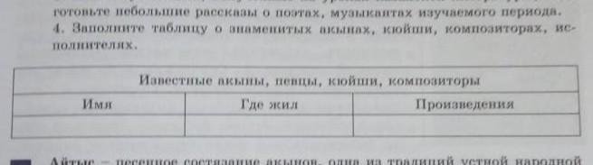 Заполните таблицу его знаменитых композиторов исполнителях таблица история Казахстана поможите пожалуйста