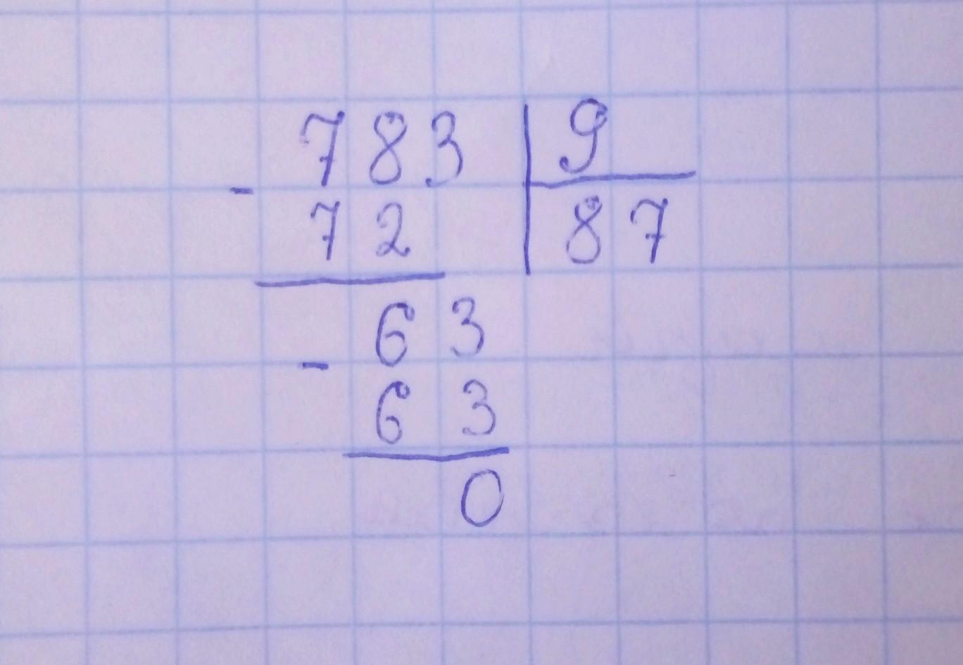 Записываем, отнимаем, получается 6. 6 тоже не делится на 9, поэтому мы берём число 3 и получается 63. 63 делим на 9, получается 7. Записываем. Получается, что число 783 делится на 9 без остатка.