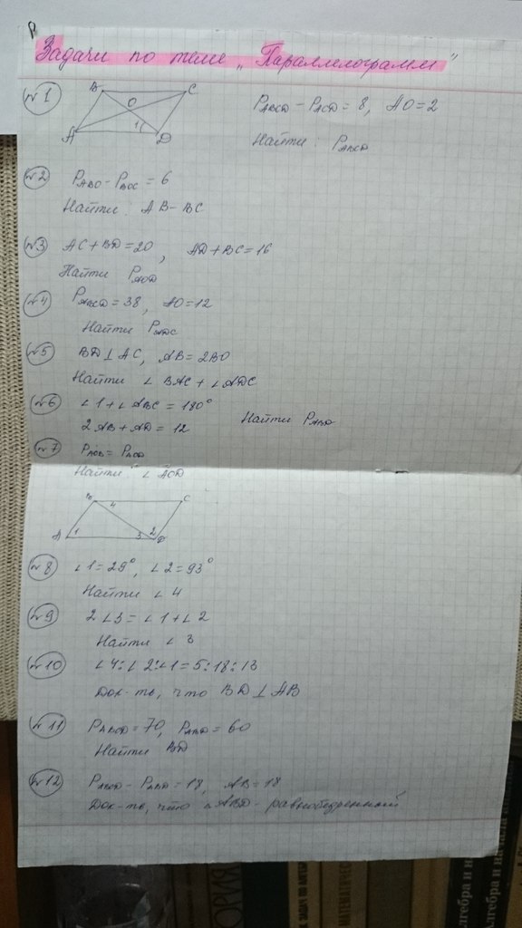 Задачи по теме ПАРАЛЛЕЛОГРАММ. с обьяснениями и точным решением (если не знаете парочку задач , не пишите , главное чтоб большенство сделано было :)