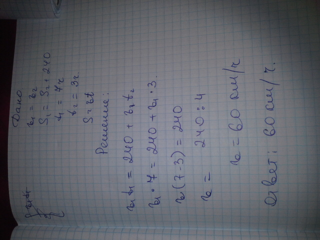 Два автобуса двигались с одинаковой скоростью.Первый автобус был в пути 7ч, а второй-3ч.С какой скоростью двигались автобусы, если первый их них проехал на 240 км больше, чем второй?