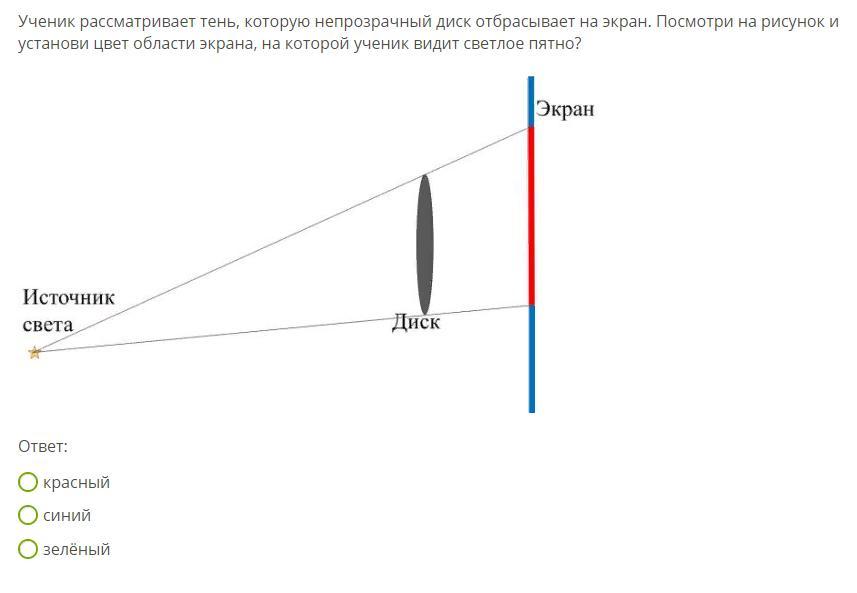 Ученик рассматривает тень, которую непрозрачный диск отбрасывает на экран. Посмотри на рисунок и установи цвет области экрана, на которой ученик видит светлое пятно?