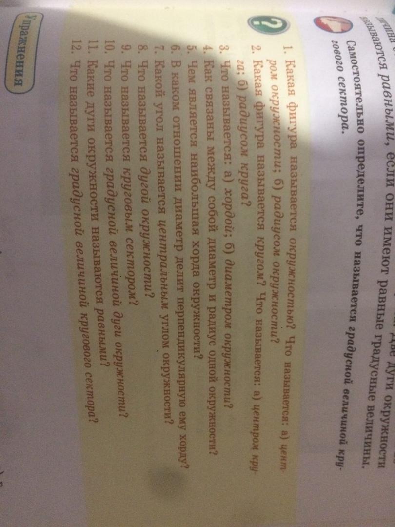 Конспект(коротенький и понятный) на тему:Что такое окружность,радиус,секущая,хорда,диаметр,дуга,полуокружность.Картинки чертежей.И ответить на вопросы(на картинке)