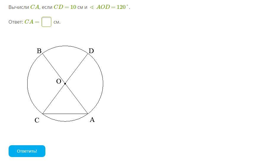 Вычисли CA, если CD = 10 см и ∢ AOD = 120°.