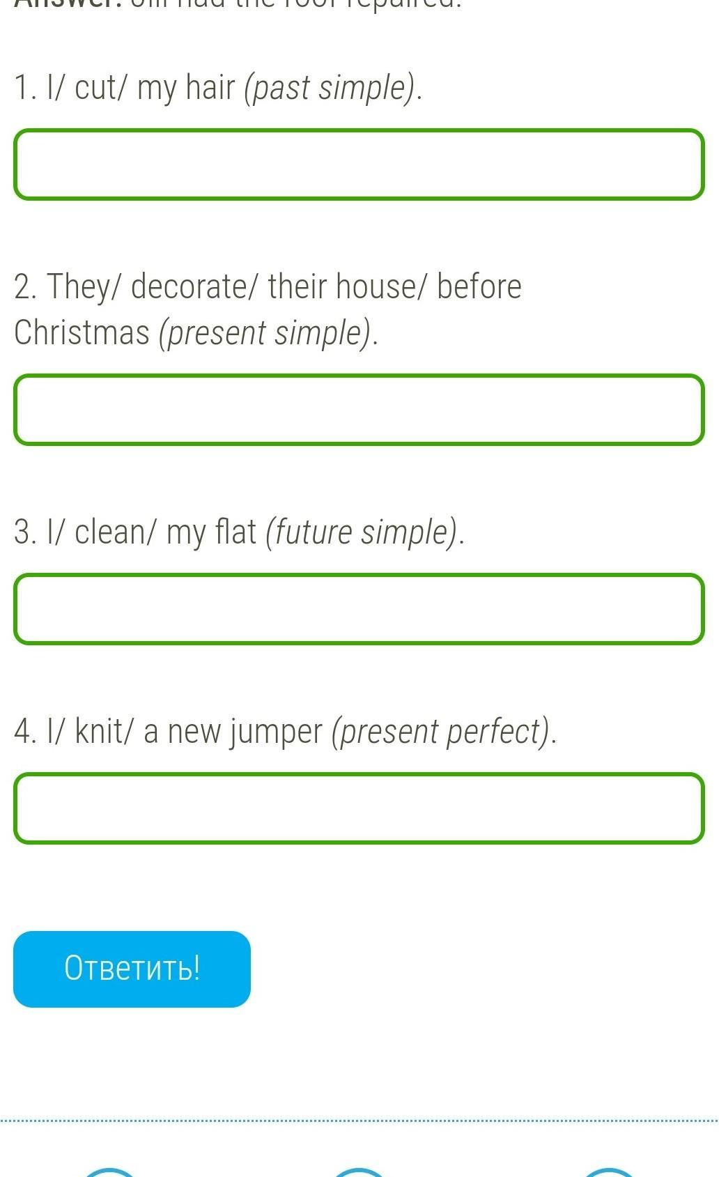 Make sentences with the construction have something done. Use the tense in brackets. (Составь предложения из слов. Используй конструкцию have something done во времени, указанном в скобках.)