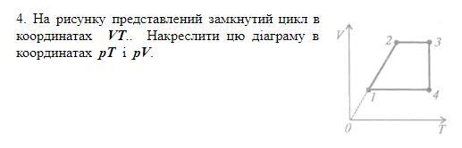 На рисунку представлений замкнутий цикл в координатах VT.. Накреслити цю діаграму в координатах pT і pV.