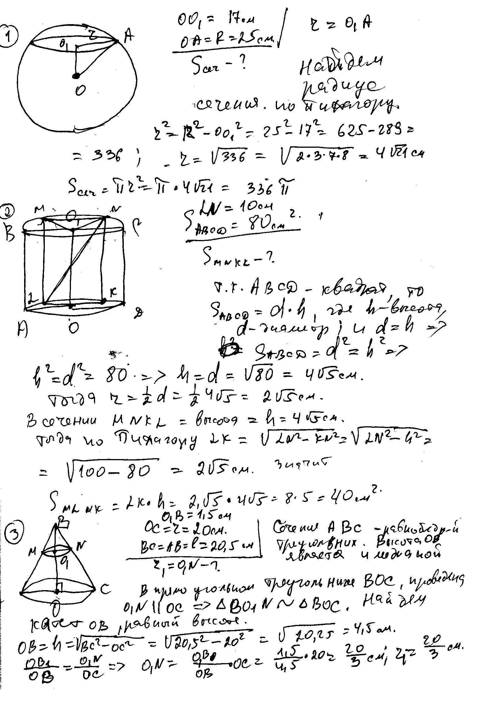 1. В шаре радиуса 25 см на расстоянии 17 см от центра проведена секущая плоскость. Найдите площадь полученного сечения.