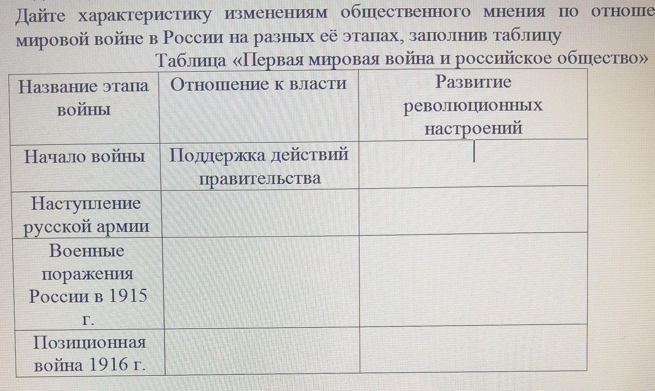 Помогите, пожалуйста! Нужно заполнить таблицу по первой мировой войне "первая мировая война и российское общество", дать характеристику общественного мнения на разных этапах. ДАЮ 90 БАЛЛОВ!!!