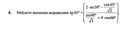 tg45^circ +left (dfrac{2cdot sin30^circ -frac{cos45^circ }{sqrt2}}{frac{sin60^circ }{sqrt3}+4cdot cos60^circ }right)=1+dfrac{2cdot frac{1}{2}-frac{sqrt2/2}{sqrt2}}{frac{sqrt3/2}{sqrt3}+4cdot frac{1}{2}}=\\\=1+dfrac{1-frac{1}{2}}{frac{1}{2}+2}=1+dfrac{frac{1}{2}}{frac{5}{2}}=1+dfrac{1}{5}=dfrac{6}{5}=1,2