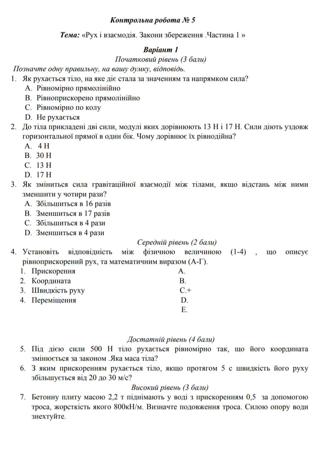 Контрольна робота з фізики "Рух та взаємодія. Закони збереження енергії". Допоможіть зробити завдання