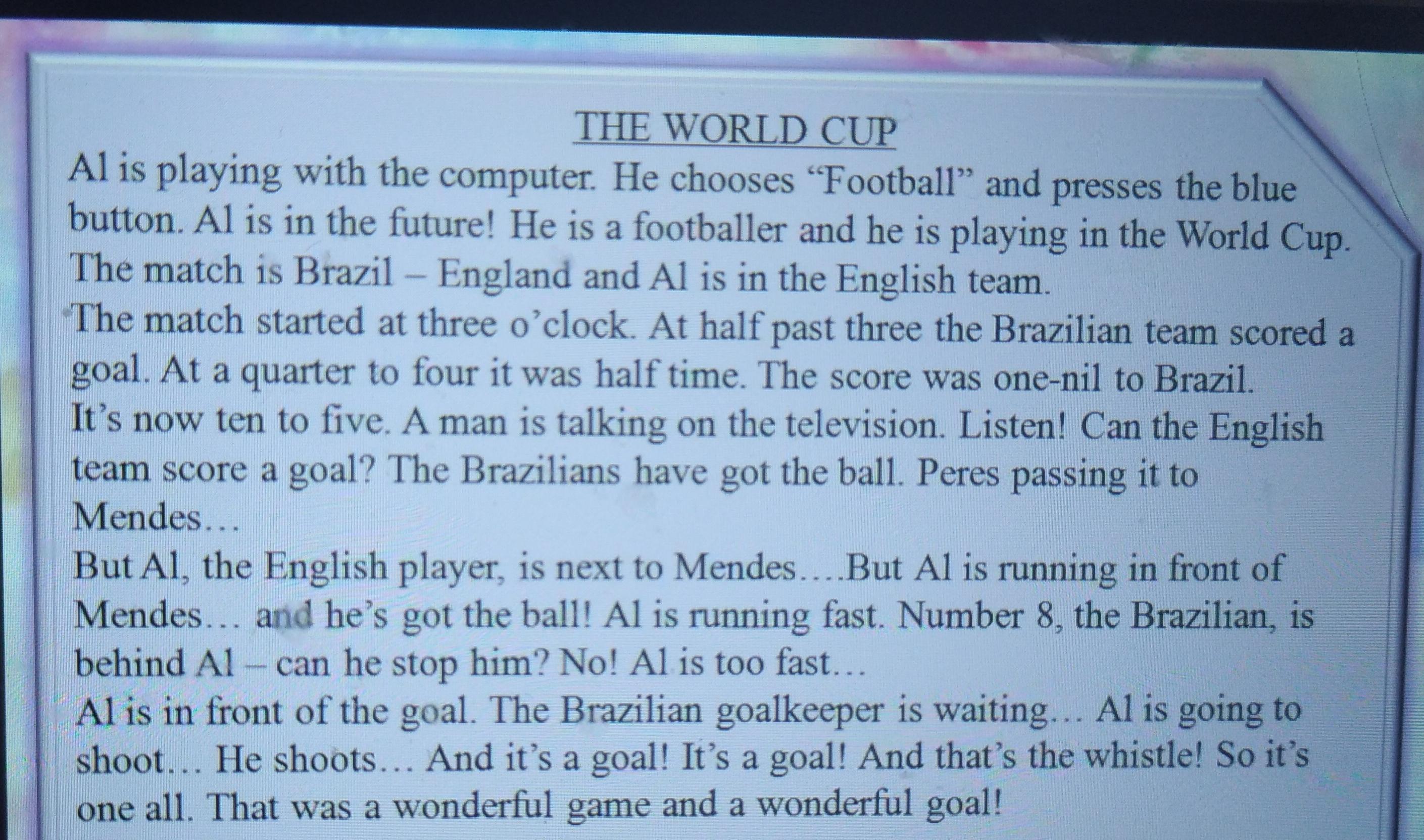 кнопка. Эл находится в будущем! Он футболист, и он играет на Чемпионате Мира.