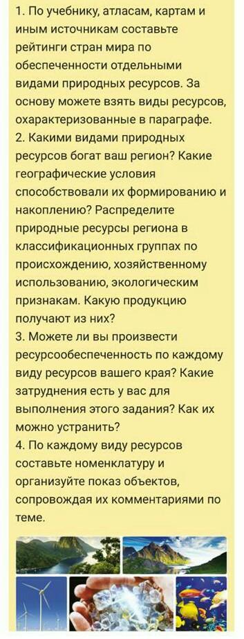 1. Страны с высоким показателем ресурсообеспеченности различными видами природных ресурсов-Россия, Канада, Китай, Бразилия, Австралия 2. Страны со средним показателем ресурсообеспеченности различными видами природных ресурсов-Монголия, Казахстан, Украина, Индия 3. Страны с низким показателем ресурсообеспеченности различными видами природных ресурсов- Япония, КНДР, Швейцария, Австрия, Бельгия 4. Страны с высоким показателем ресурсообеспеченности топливными ресурсами A) Уголь - Россия, США, Китай, Индия Б) Бурый уголь-США, Россия В) Природный газ Россия, Иран, Туркмения, Алжир Г) Нефть - Саудовская Аравия, Ирак, Иран, ОАЭ, Кувейт, Венесуэла 5. Страны с высоким показателем ресурсообеспеченности минеральными ресурсами A) Руды чёрных металлов - железная руда- Россия, Украина, Австралия, Бразилия - марганцевые руды ЮАР, Бразилия, Австралия, Украина, Габон хромовые руды ЮАР, Казахстан Б) Руды цветных металлов -медные руды Канада, ОША, Чили, Конго, Замбия алюминиевые руды Гвинея, Бразилия, Австралия - никелиевые руды— Россия, Канада, ЮАР - оловянные руды — Китай, Малайзия, Индонезия, Бразилия, Боливия 6. Страны с высоким показателем ресурсообеспеченности земельными ресурсами- США,Россия, Канада, Австралия, Бразилия, Казахстан 7. Страны с высоким показателем ресурсообеспеченности водными ресурсами — Бразилия, Россия, США, Канада. 8. Страны с высоки показателем ресурсообеспеченности лесными ресурсами Россия, Канада, Бразилия, США, ДР Конго, Гайана, Суринам Вывод: Страны мира обеспечены природными ресурсами неравномерно. Обеспеченность минеральными топливными ресурсами зависит от тектонического строения территорий стран. Обеспеченность водными, лесными земельными ресурсами зависит от положения стран в климатических поясах.