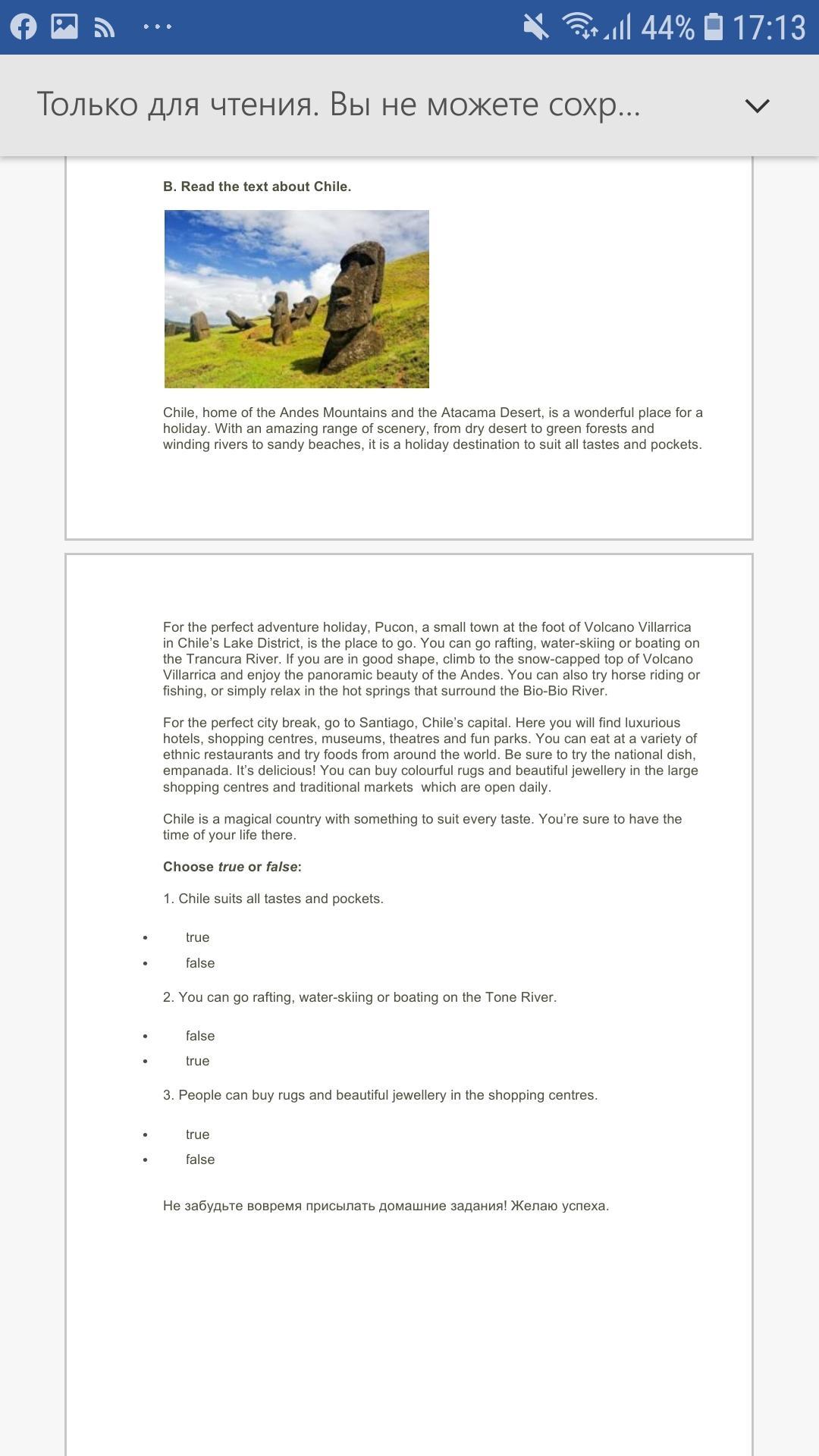 winding rivers to sandy beaches, it is a holiday destination to suit all tastes and pockets. For the perfect adventure holiday, Pucon, a small town at the foot of Volcano Villarrica in Chile's Lake District, is the place to go. You can go rafting, water-skiing or boating on the Trancura River. If you are in good shape, climb to the snow-capped top of Volcano Villarrica and enjoy the panoramic beauty of the Andes. You can also try horse riding or fishing, or simply relax in the hot springs that surround the Bio-Bio River. For the perfect city break, go to Santiago, Chile's capital. Here you will find luxurious hotels, shopping centres, museums, theatres and fun parks. You can eat at a variety of ethnic restaurants and try foods from around the world. Be sure to try the national dish, empanada. It's delicious! You can buy colourful rugs and beautiful jewellery in the large shopping centres and traditional markets which are open daily. Chile is a magical country with something to suit every taste. You're sure to have the time of your life there.