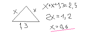 Периметр равнобедренного треугольника равен 2.5м,а основание 1.3м.Найдите бокувую сторону треугольника.