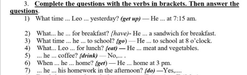 1) What time did Leo get up yesterday? - He got up at7:15 am.