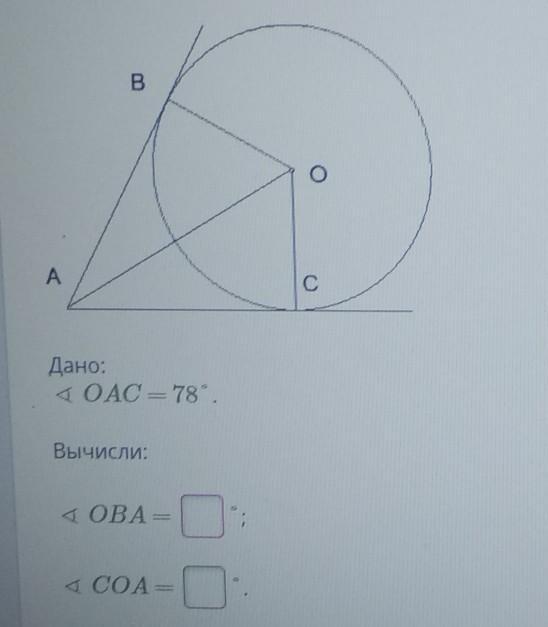 Т.К угол OAC = 78 градусов, а угол ACO = 90 градусов (потому что действует правило), то угол COA = 180 - (78 + 90) = 12 градусов.