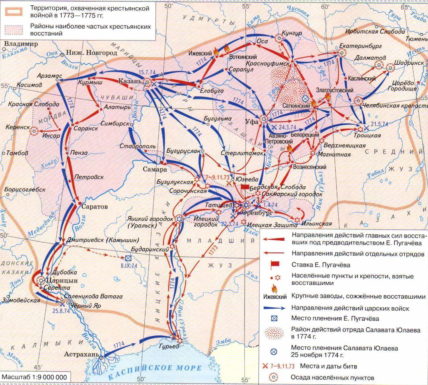 В тетради зачертите и раскрасьте цветными карандашами район выступления под предводительством Е. Пугачева, стрелками разных цветов обозначьте движение восставших и правительственных войск, направленных на их подавление. Укажите города и крепости, где проходили основные сражения, укажите место пленения Е. Пугачева. Для рисования за ориентир возьмите Каспийское море, Волгу и Яик (Урал). Не забудьте условные знаки.