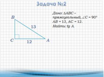 Задача: Дан ΔABC — прямоугольный, ∠C = 90°, AB = 13, AC = 12. Найти tg A.