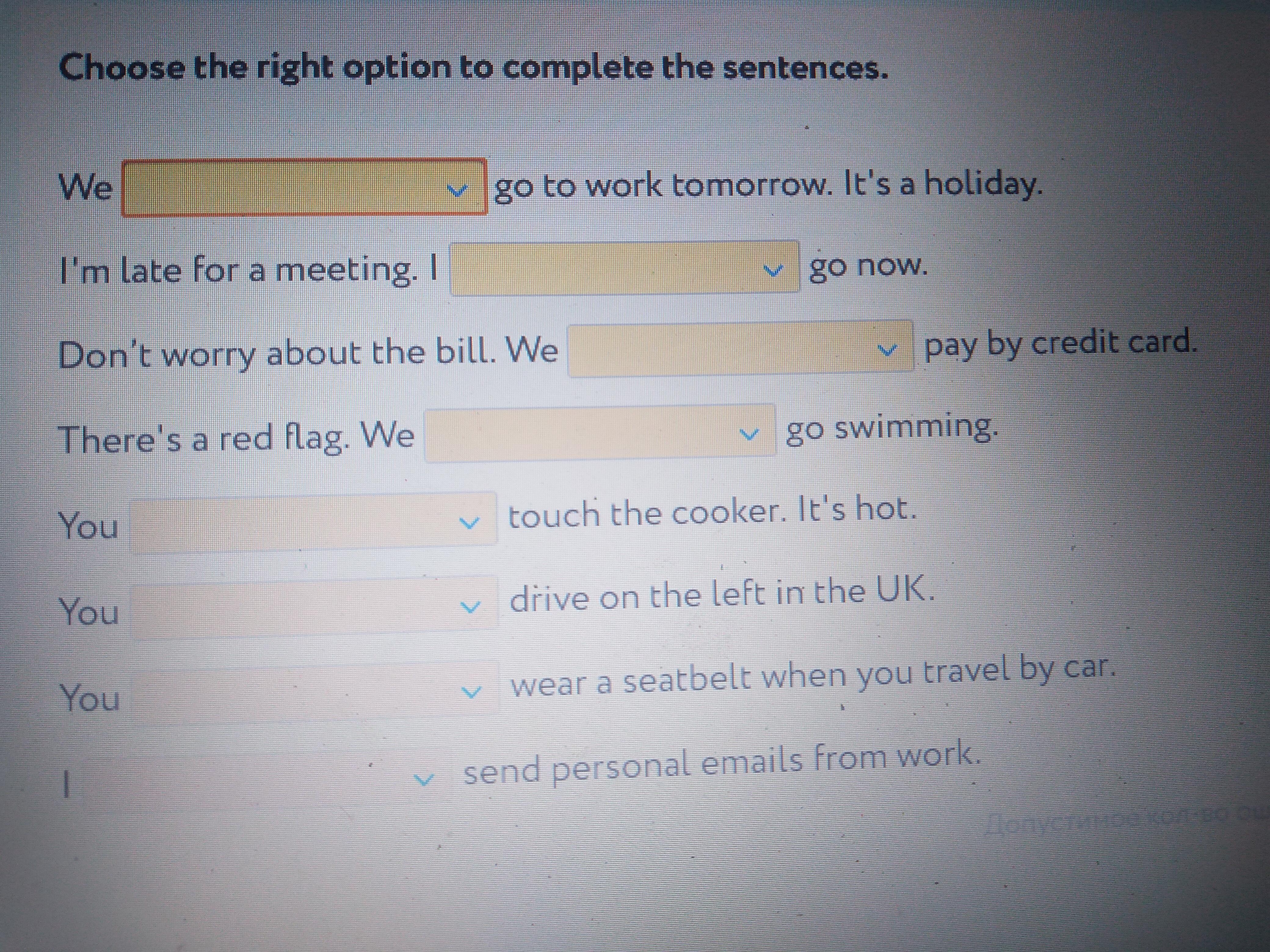 Помогите с английским , заранее спасибо. Выбрать must/have to/can или mustn't /don't have to/can't / both are correct