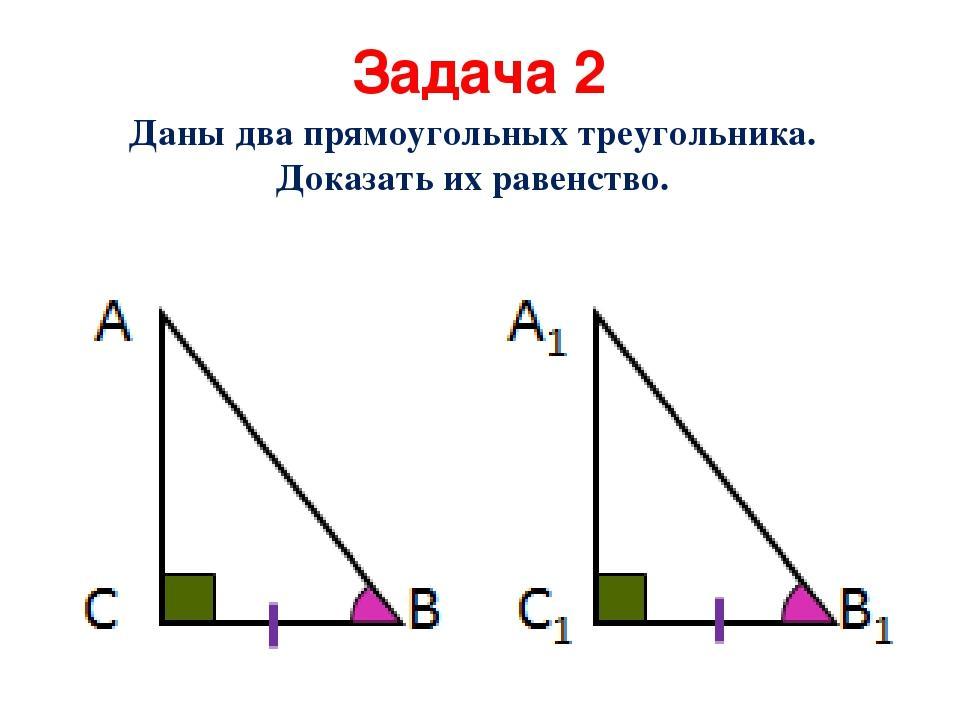 2) В задаче №2 треугольники равны по катету и прилежащему к нему острому углу. ( Второй признак равенства треугольников)