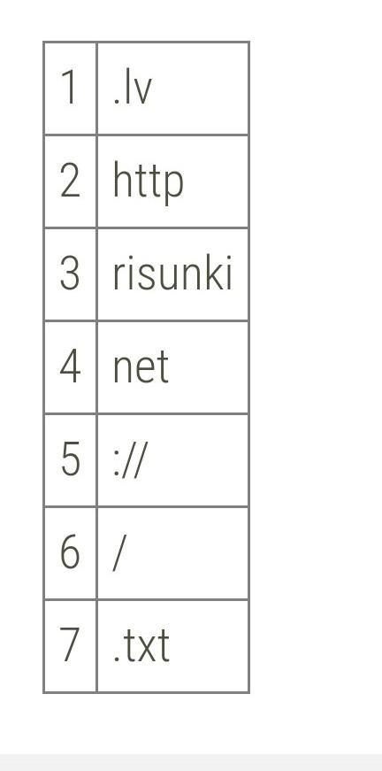 Доступ к файлу net.txt, находящемуся на сервере risunki.lv, осуществляется по протоколу http. В таблице фрагменты адреса файла закодированы цифрами от 1 до 7. Запиши последовательность цифр, кодирующую адрес указанного файла в сети Интернет