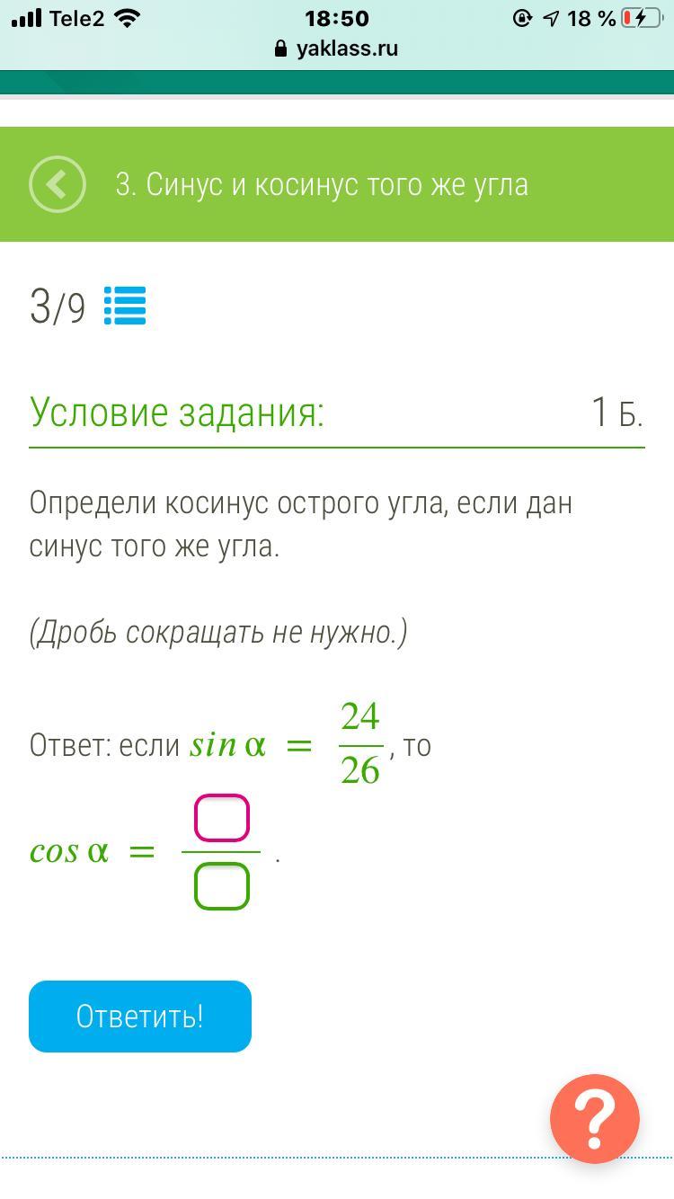 я могу тебе сказать что косинус пока будет найти сложно но можно найти другую сторону если применив теорему Пифагора у тебя есть противолежащий катет и есть гипотенуза найдёшь другой катет там тебя получится 10.