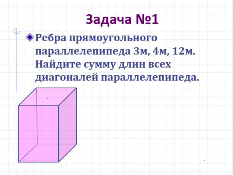 одна диагональ параллелепипеда D= под корнем (a^2+b^+2h^2) = под корню(4^2+6^2+12^2)