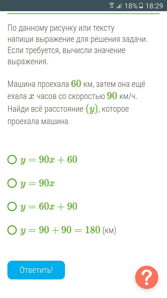 Машина проехала 60 км, затем она ещё ехала x часов со скоростью 90 км/ч. Найди всё расстояние (y) , которое проехала машина.