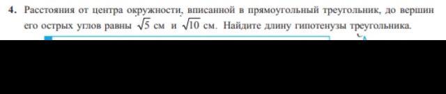 Расстояние от центра окружности, вписанной в прямоугольный треугольник, до вершин его острых углов равны √5 см и √10 см. Найдите длину гипотенузы треугольника помогите решить пожалуйста