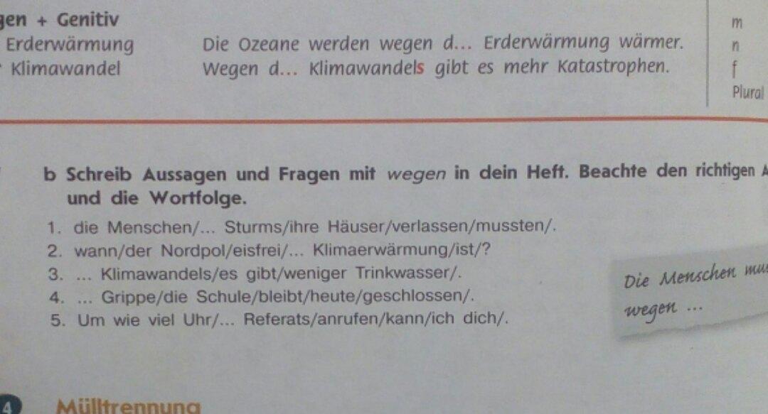 Schreib Aussagen und Fragen mit wegen in dein Heft. Beachte den richtigen Artikel und die Wortfolge/