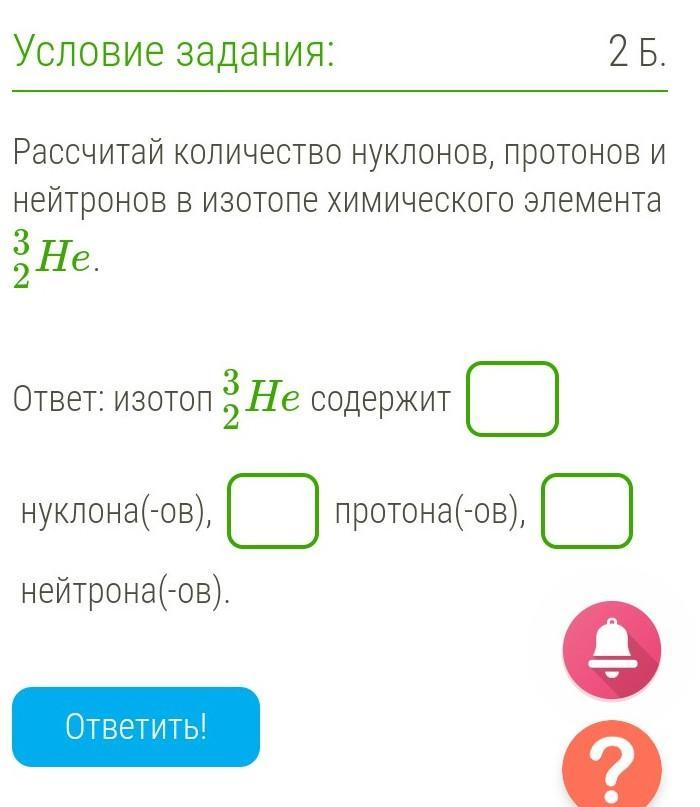 Рассчитай количество нуклонов, протонов и нейтронов в изотопе химического элемента.