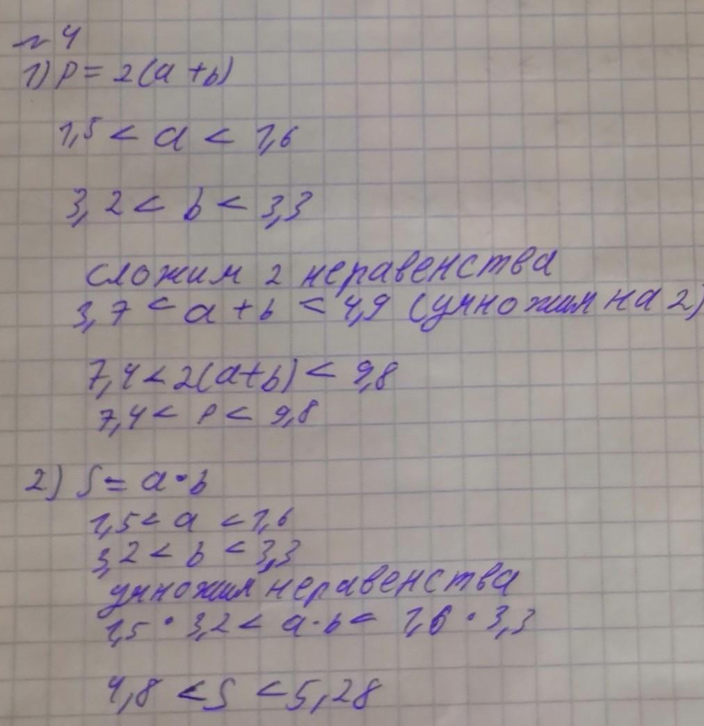 4. Оцените периметр и площадь прямоугольника со сторонами а см и b см, если известно, что 1,5 < а < 1,6 и 3,2 < b < 3,3.