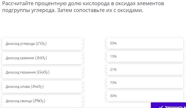 Рассчитайте процентную долю кислорода в оксидах элементов подгруппы углерода. Затем сопоставьте их с оксидами.
