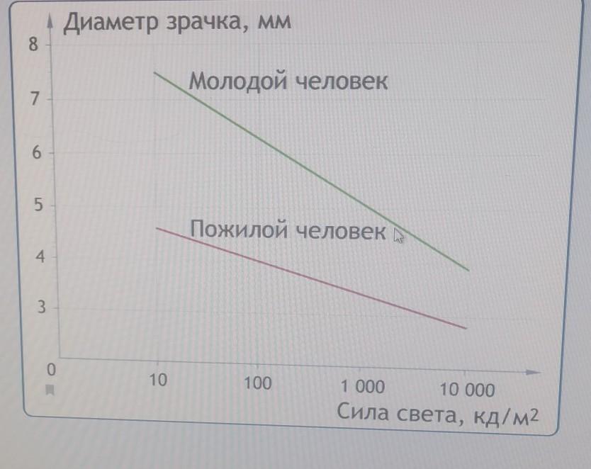 Рассмотрите график зависимости диаметра зрачка от силы света Посчитайте Во сколько раз уменьшается диапазон расширение зрачков пожилого человека по сравнению с молодым Ответ округлите до целых