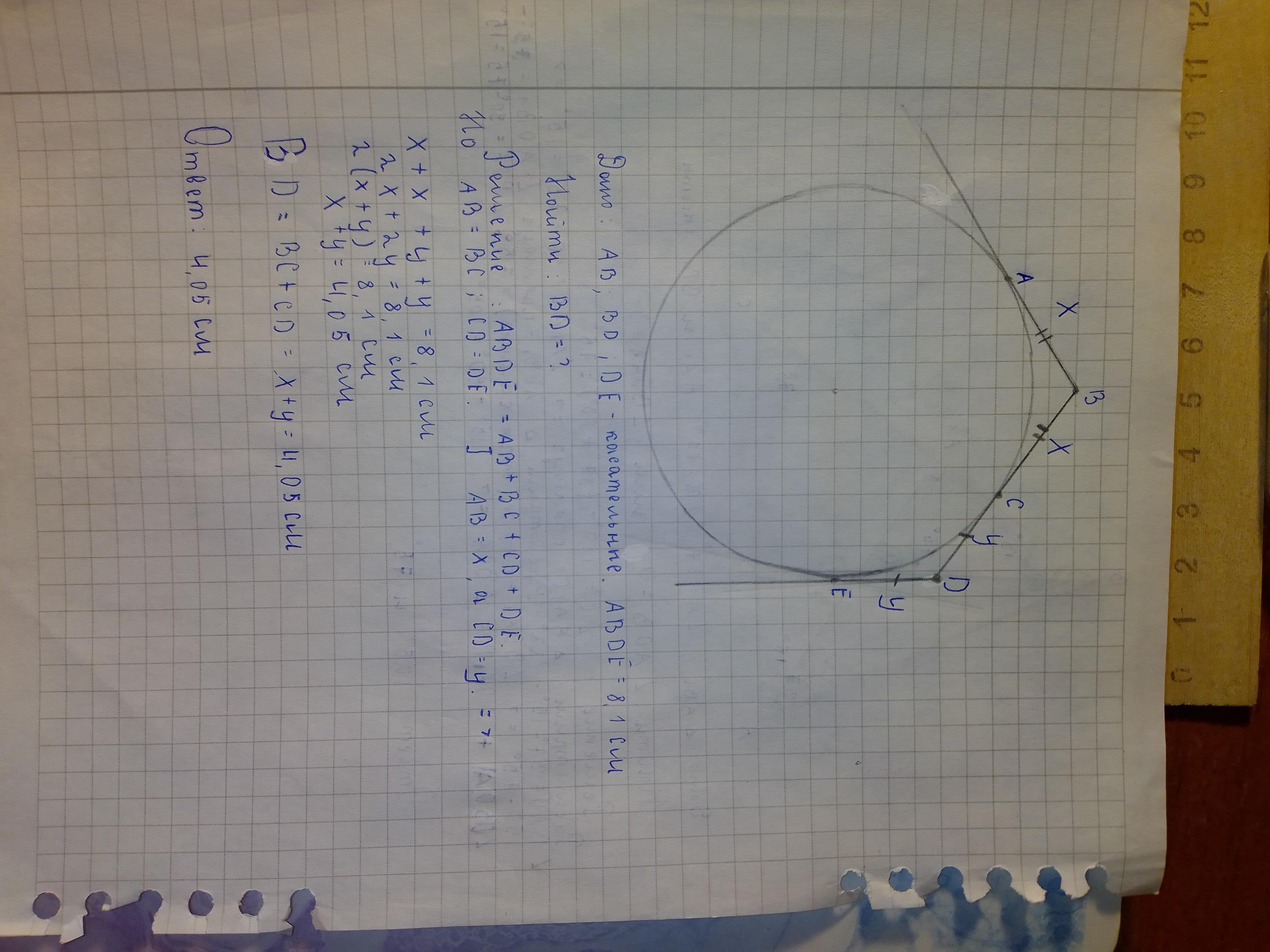 Проведены касательные к окружности AB, BD и DE так, что A, C и E — точки касания. Длина ломаной ABDE равна 8,1 см.