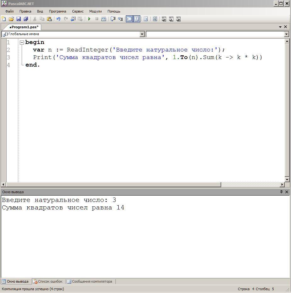 Print('Сумма квадратов чисел равна', 1.To(n).Sum(k -> k * k))