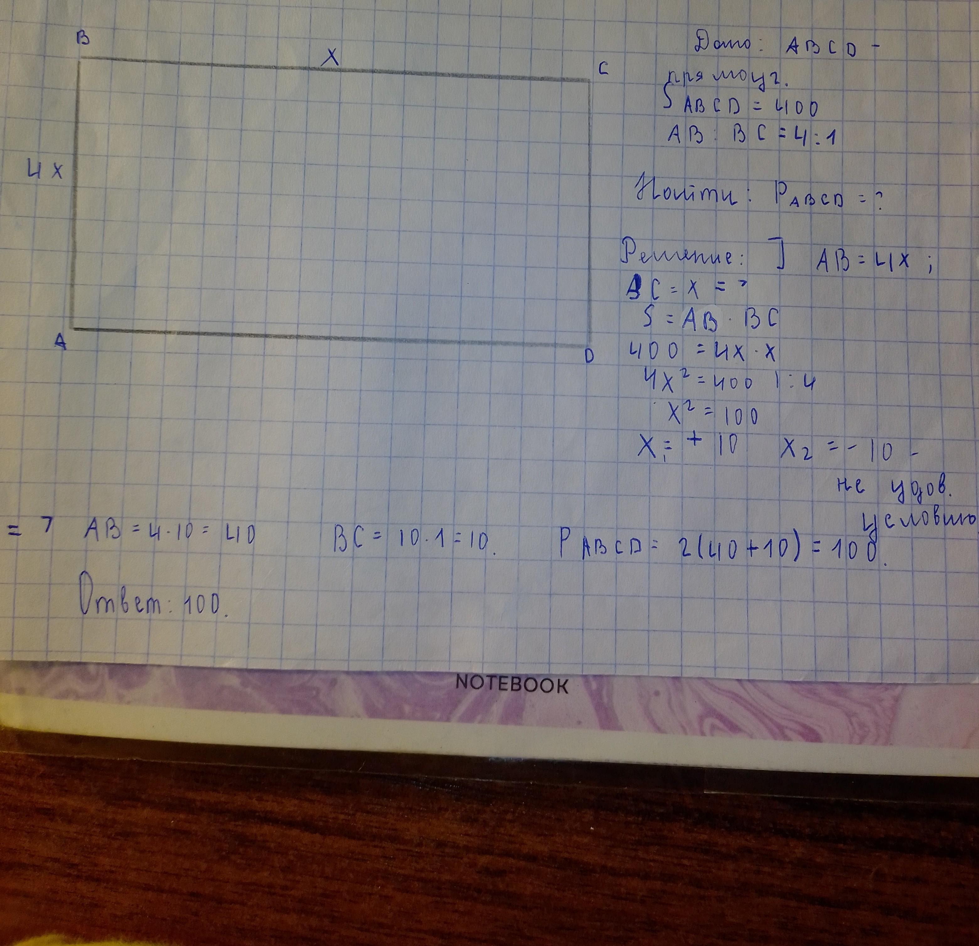 Помогите срочно!!!!! Найдите периметр прямоугольника,если его площадь равна 400 ha,а отношение смежных сторон равно 4:1