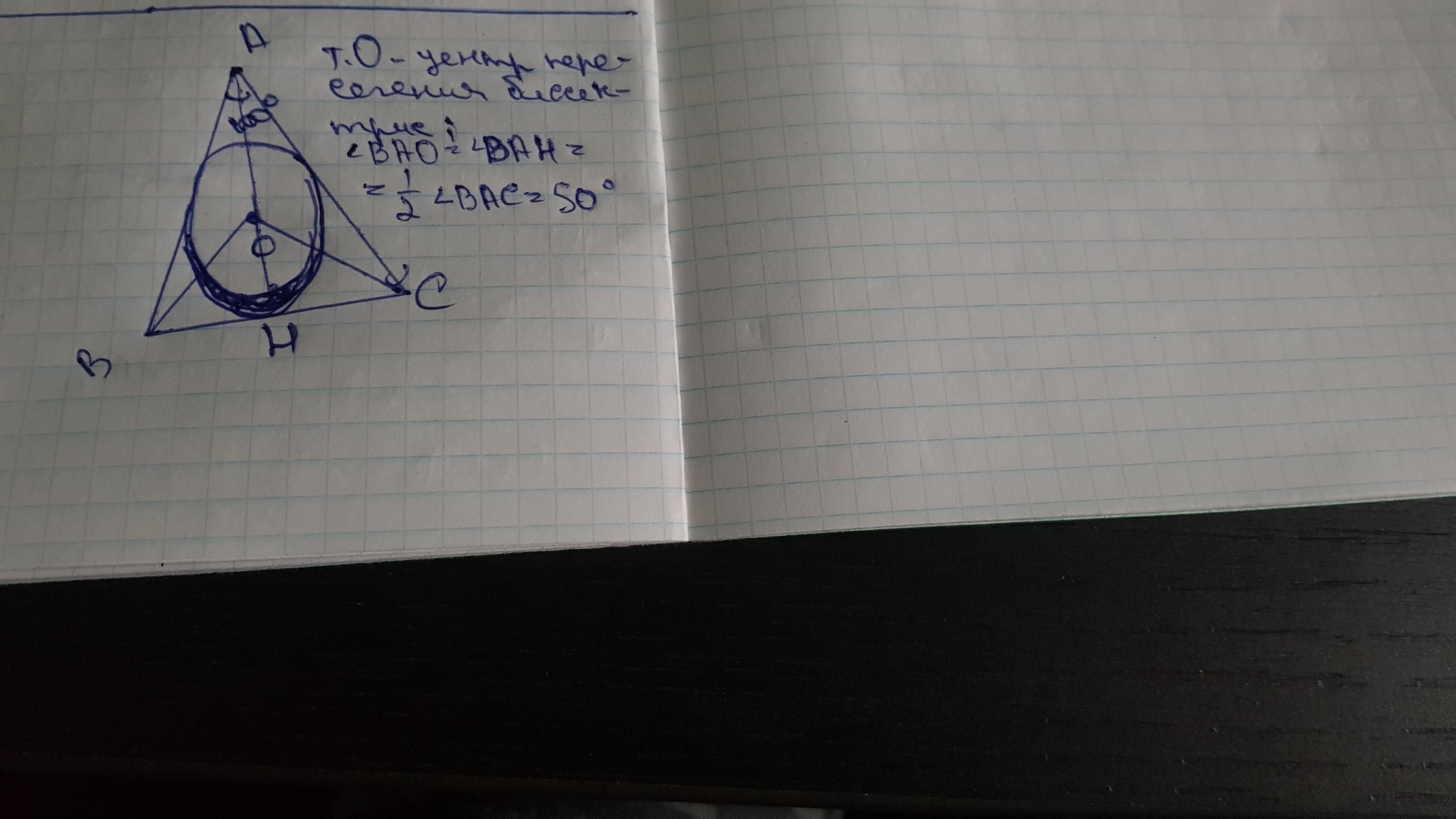 Центр вписаного в трикутник кола лежить на перетені бісектрис цього трикутника отже кут ВАО = 100/2 =50