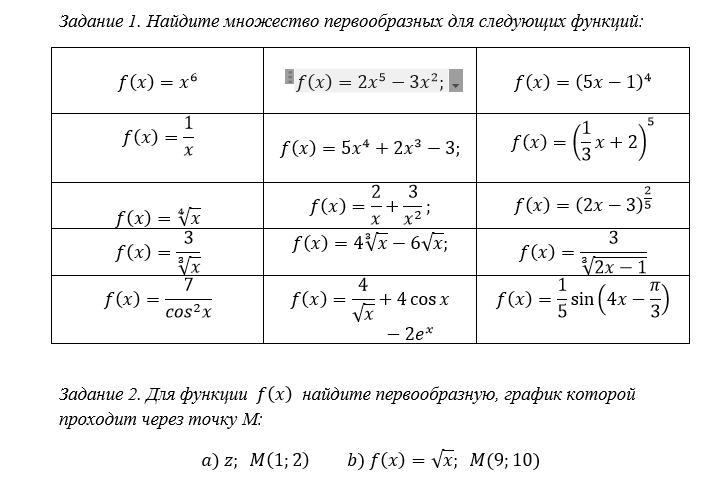 1. Найдите множество первообразных для следующих функций