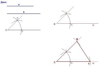 Теперь с помощью линейки соединяем точки В и С. Получаем треугольник АВС, в котором по построению АВ = МК, АС = ОЕ, ВАС =hk, следовательно, треугольник АВС - искомый.