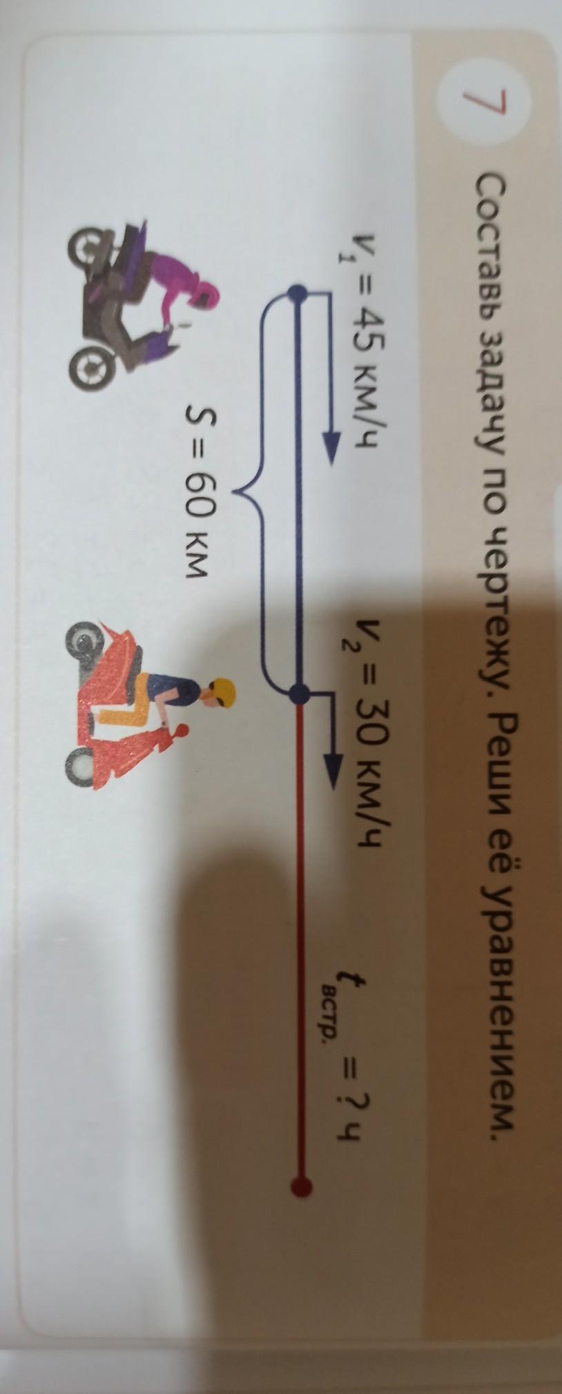 Первый мотоциклист начал двигаться со скоростью 45км/ч. Одновременно с ним, через 60 километров в том же направлении, начал двигаться второй со скоростью 30км/ч. Через сколько часов они встретятся?
