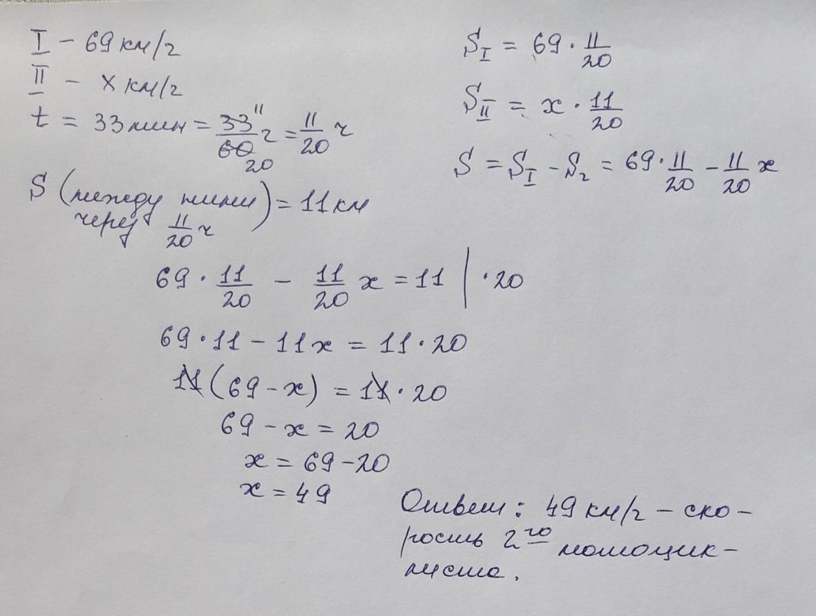 Из города одновременно в одном и том же направлении выехали два мотоциклиста. Скорость первого из них была больше скорости второго и составляла 69 км/ч. Через 33 мин расстояние между мотоциклистами было равно 11 км. Найдите скорость второго мотоциклиста. Помогите пожалуйста решить задачу!