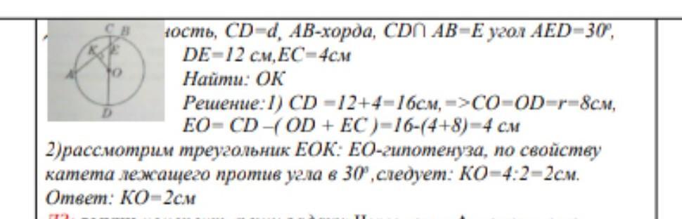 разность ,СВ=d,AB-хорда ,COU AB=E угол АЕD=30°,DE=12,EC=4Найти ОК решение:1CD=12+4=16см=>CO=OD=r=8смЕо=СО-(OD+EC)=16-(4+8)=4см