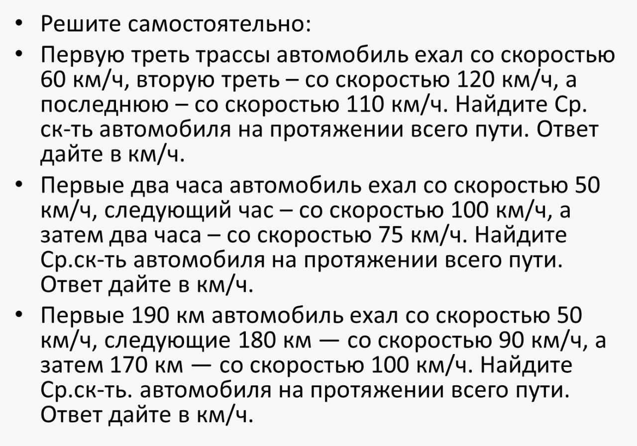 Чтобы найти среднюю скорость на протяжении пути, нужно весь путь разделить на все время движения.