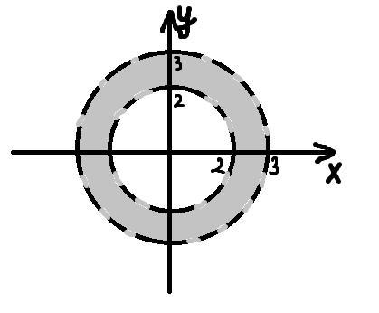 Значит, неравенство определяет кольцо, ограниченное окружностями с радиусами 2 и 3.
