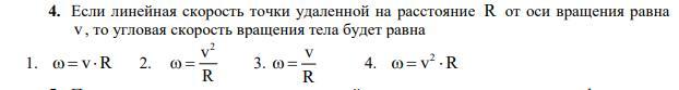 2 Если линейная скорость точки удаленной на расстояние R от оси вращения равна v , то угловая скорость вращения тела будет равна? (тоже формула).