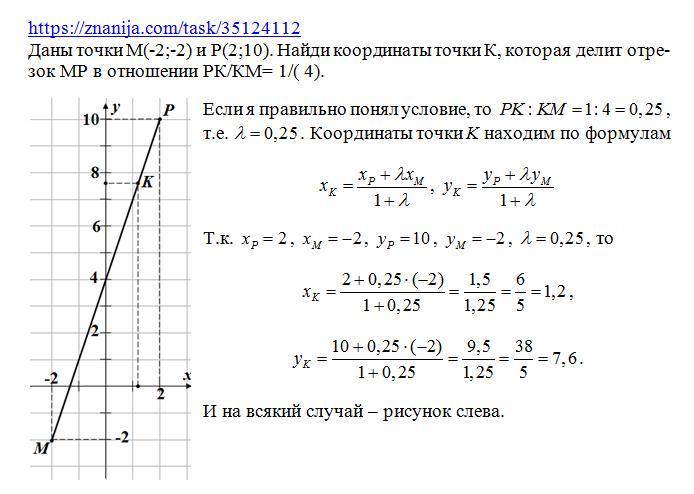 Даны точки М(-2;-2) и Р(2;10). Найди координаты точки К, которая делит отрезок МР в отношении РК/КМ= 1/( 4)