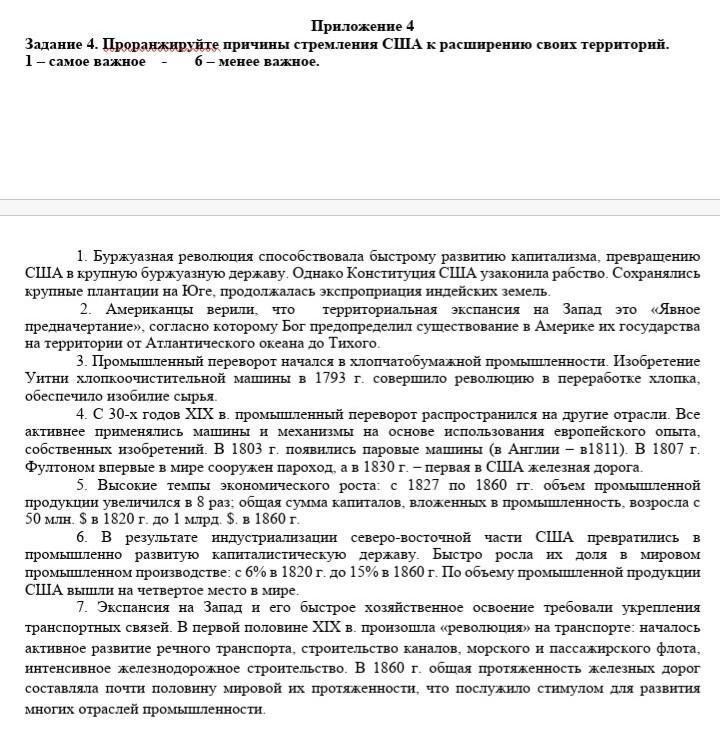 Задание 4. Проранжируйте причины стремления США к расширению своих территорий. 1 – самое важное - 6 – менее важное. Приложение 4