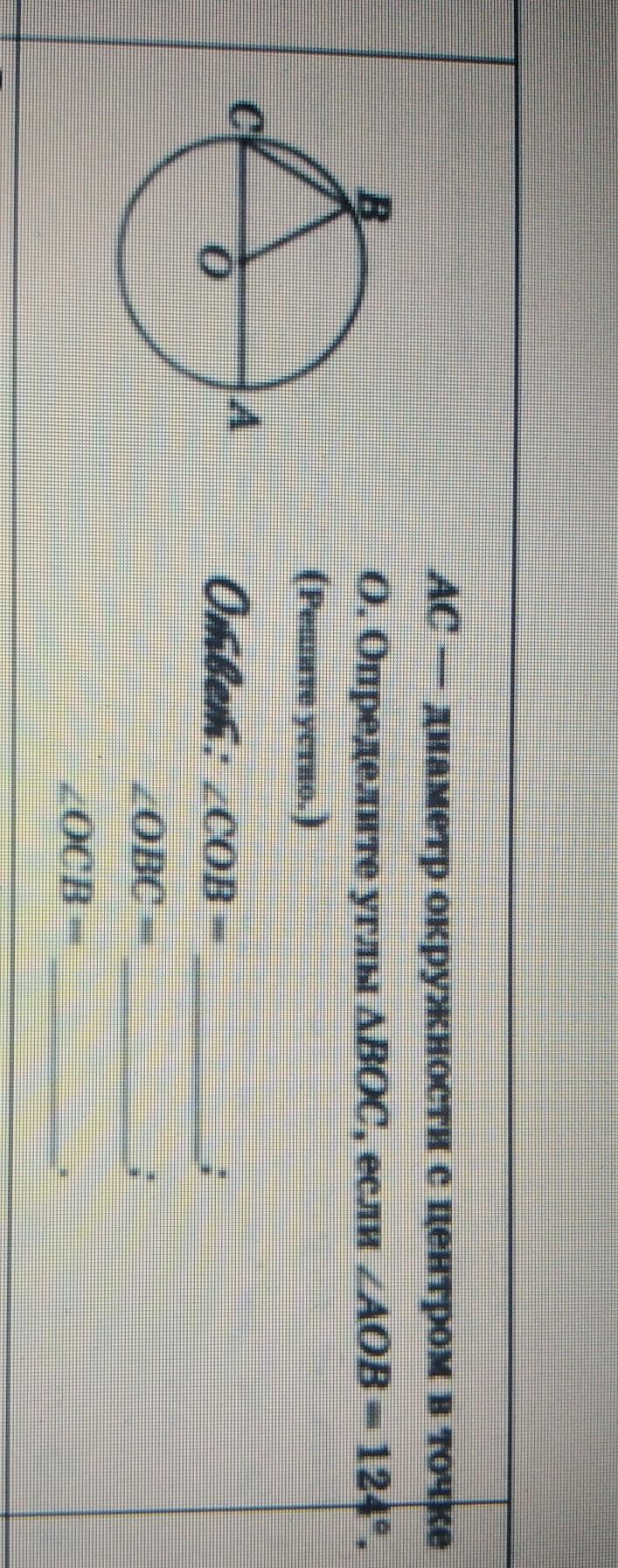 Ас- диаметр окружности с центром в точке О. Определите углы ВОС, если АОВ=124° СОВ=? ОВС=? ОСВ=?