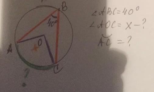 Т. К. Угол АВС-вписанный, то дуга, на которую он опирается, в два раза больше. Дуга АС=40°×2=80°
